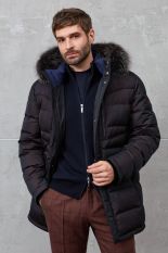 Пуховик черно-коричневого цвета с капюшоном и опушкой из меха