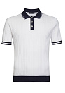 Поло из хлопка Пима (Pima cotton). Ткань очень мягкая и приятная на ощупь, легкая, прочная и устойчива к сминанию. Застежка на пуговицы. Цвет поло белый с синими манжетами и воротником. Вертикальные фактурные косы делают силуэт визуально более стройным.