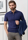Поло из хлопка Пима (Pima cotton) с добавлением шелка и льна. Ткань очень мягкая и приятная на ощупь, легкая, прочная и устойчива к сминанию. Застежка на молнию. Цвет синий с фактурными тонкими косами. Вертикальный орнамент делает силуэт визуально более стройным.