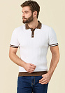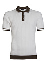 Поло с воротником на пуговицах белого цвета с фактурным орнаментом в виде плетеных кос. Воротник, полоски на рукавах и резинка внизу поло коричневого цвета. Ткань из хлопка Пима - очень нежная, приятная на ощупь, при этом достаточно прочная и гипоаллергенная.
