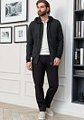 Трикотажный спортивный костюм черно-серый с капюшоном. Толстовка с застежкой на металлическую молнию. Понизу толстовки и на рукавах трикотажные манжеты, 2 внешних кармана на молнии, 1 внутренний карман на молнии. Брюки слегка заужены книзу; пояс брюк на широкой резинке, ширина по талии дополнительно регулируется кулиской со шнурком; 4 внешних кармана: 2 на молниях. Основная ткань толстовки с мелким v-образным орнаментом. Подкладка, манжеты рукавов, пояс толстовки, а также брюки - темно-синего цвета. Технологичные материалы обеспечивают отличную воздухопроницаемость, а продуманный дизайн – свободу движений.