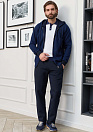 Трикотажный спортивный костюм темно-синего цвета с капюшоном. Толстовка с застежкой на металлическую молнию. Понизу толстовки и на рукавах трикотажные манжеты, 2 внешних кармана на молнии, 1 внутренний карман на молнии. Брюки слегка заужены книзу; пояс брюк на широкой резинке, ширина по талии дополнительно регулируется кулиской со шнурком; 4 внешних кармана: 2 на молниях. Основная ткань толстовки с мелким v-образным орнаментом, идеально соединяющим оттенки синего цвета. Подкладка, манжеты рукавов, пояс толстовки, а также брюки - темно-синего цвета. Технологичные материалы обеспечивают отличную воздухопроницаемость, а продуманный дизайн – свободу движений.