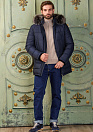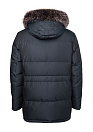 Стеганый пуховик с капюшоном и меховой опушкой. Длина по спинке в размере 50: 86 см. Цвет: темно-синий с микродизайном. Стежка горизонтальная, выполнена вручную. На рукаве расположен фирменный знак (вставка из алькантары с вышивкой). Застежка на металлическую молнию с двумя бегунками. Воротник-стойка, внутренняя сторона воротника из мягкой микроворсовой ткани. Съемный капюшон на кнопках, планка убирается в воротник, пата регулирует глубину капюшона, кулиска регулирует объем по краю. Съемная меховая опушка на молнии и кнопках. Мех: сноуфрост. Съемные трикотажные манжеты на молниях. Внешние карманы: 4 на молниях. 2 внутренних кармана - на молниях. Ткань верха защищает от ветра, влаги и холода. Благодаря особым свойствам структуры волокон, способным отводить влагу - между пуховиком и телом поддерживается сухой и теплый микроклимат. Подкладка имеет оригинальный дизайн (стежка контрастными нитками и отделка кантами). Утеплитель: гусиные пух и перо (90/10%) с высоким показателем Fill Power (700-750), способен удерживать тепло при очень низких температурах.