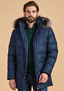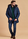 Пуховик темно-синий с капюшоном и меховой опушкой